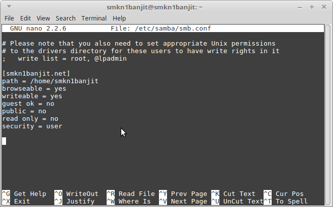 -kemudian kita akan mengkonfigurasi data atau folder yang akan di sharingkan dengan perintah nano /etc/samba/smb.conf